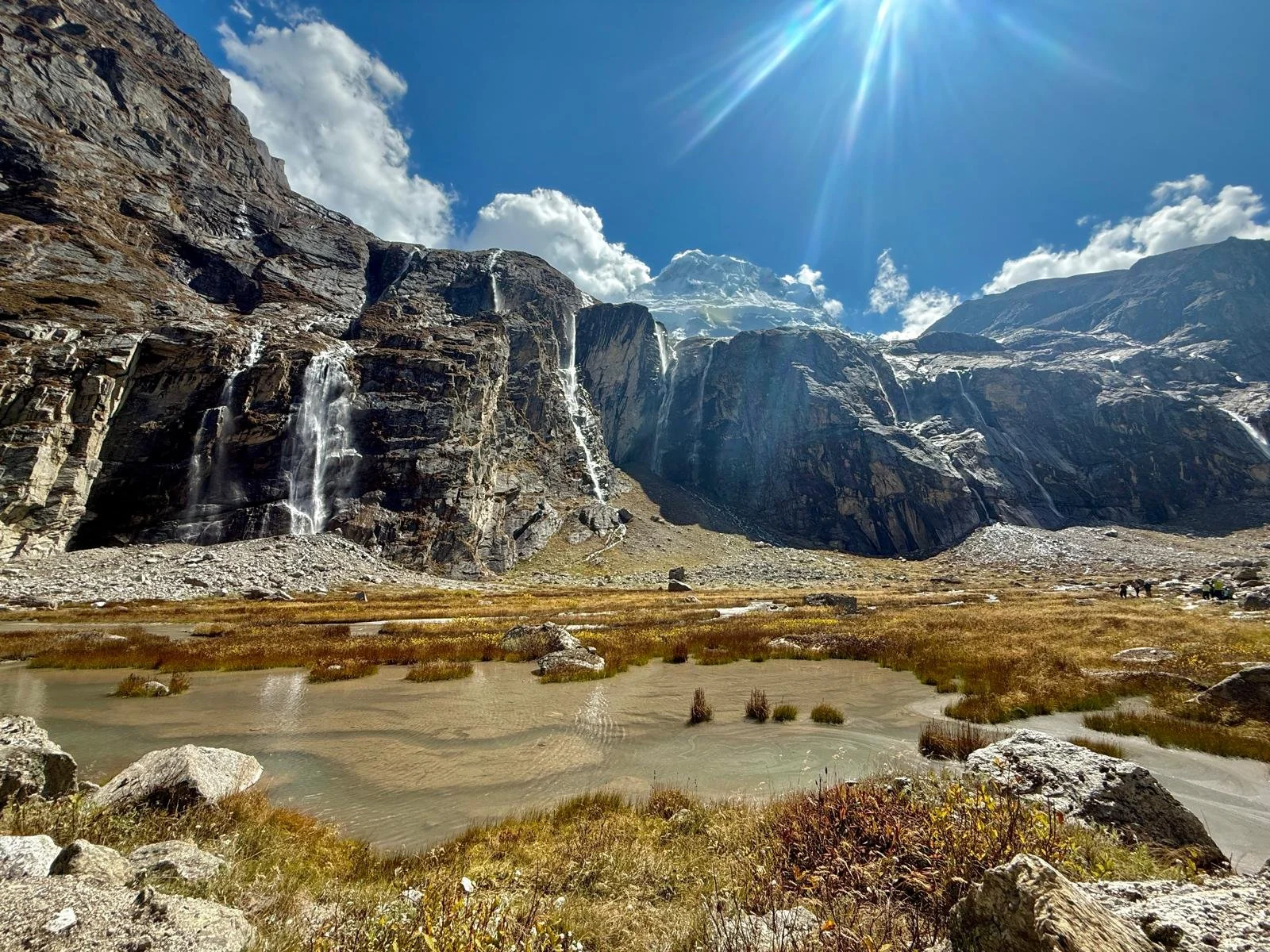 the Alaknanda River valley with the Vasudhara waterfall